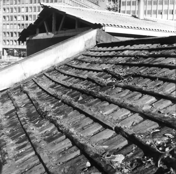 Fra rivingen av Holmens gate 5 i Oslo i Pipervika.Hele denne gata forsvant med Rådhusreguleringen. Bakgården i Holmens gate 5 er bevart på Norsk Folkemuseum, som bygning nr. 231.