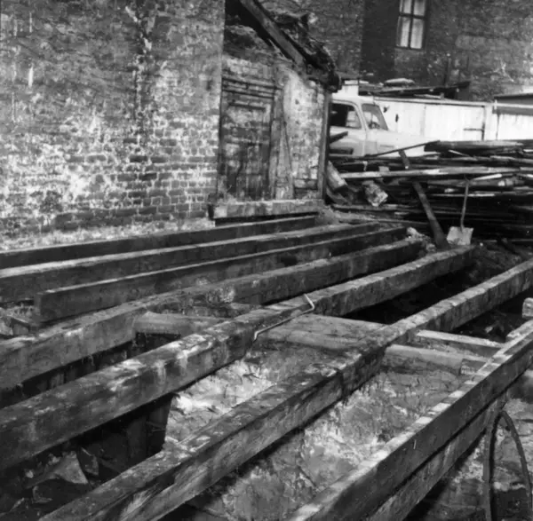 Fra rivingen av Holmens gate 5 i Oslo i Pipervika.Hele denne gata forsvant med Rådhusreguleringen. Bakgården i Holmens gate 5 er bevart på Norsk Folkemuseum, som bygning nr. 231.