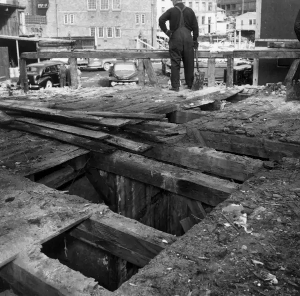 Fra rivingen av Holmens gate 5 i Oslo i Pipervika.Hele denne gata forsvant med Rådhusreguleringen. Bakgården i Holmens gate 5 er bevart på Norsk Folkemuseum, som bygning nr. 231.