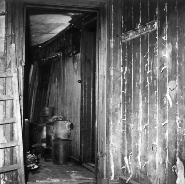Fra rivingen av Holmens gate 5 i Oslo i Pipervika.Hele denne gata forsvant med Rådhusreguleringen.Bakgården i Holmens gate 5 er bevart på Norsk Folkemuseum, som bygning nr. 231.