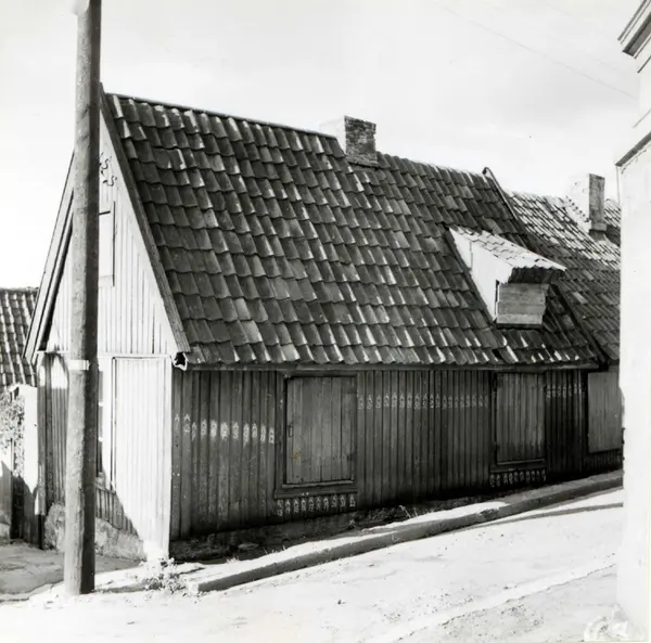 Johannesgata 4, Enerhaugen, Oslo 1959. Lavt trehus på gatehjørne, fasade mot øst. Under riving sept./okt -59. Nå på NF.