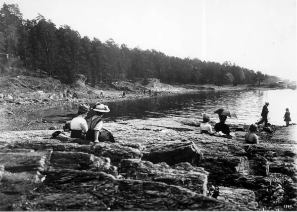 Bygdøy, Oslo 1905. Sommerliv. Mennesker på stranden, antatt Paradisbukta. Mennene i dress. Kvinnene i lange kjoler eller skjørt. Alle med hatter.