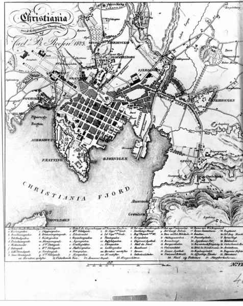 Oslo. Kart tegnet av Carl B. Rosen 1843.