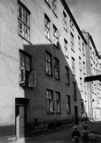 Toftes gate 22, Grünerløkka, Oslo 1961.Gårdsrommet med to små barn.