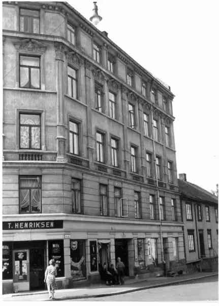 Stolmakergata 6, Oslo 1961. Gatebilde, bygård med butikk på hjørnet..