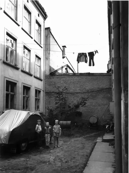 Olaf Ryes plass 10, Oslo 1961. Gutter ved siden av bil i bakgård.