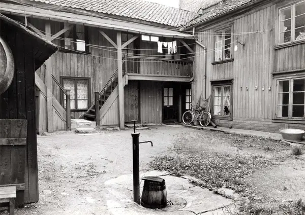 Korsgata 6, Grünerløkka, Oslo 1961. Bakgård med trehusbebyggelse og vannpost.