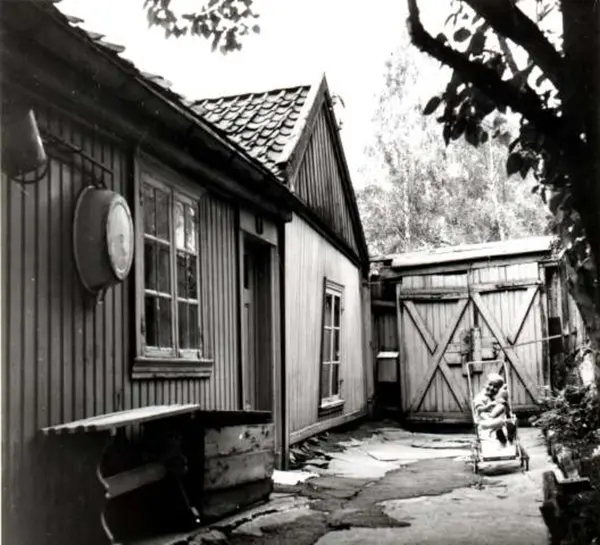 Nordre gate 3, Grünerløkka, Oslo 1961. Hus med gårdsplass og barnevogn. Østsida sett mot nord.