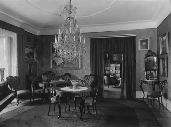Stueinteriør med sofa, bord og stoler, flygel, speil, portiérer, malerier, lysekrone. Bygdøy Alle 19, Oslo, før 1933