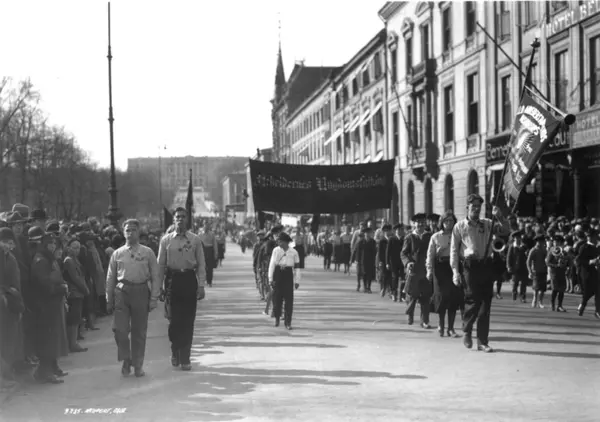 1. mai-tog, Karl Johans gate. 1930. Slottet i bakgrunnen. Toget på vei mot Stortinget. Menn med faner. Kvinner og barn. Musikkkorps. Tilskuere.