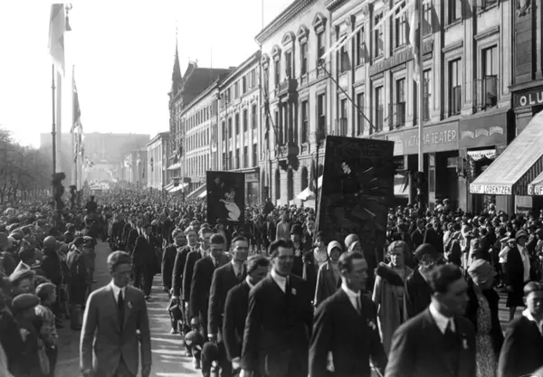 1. mai-tog, Karl Johans gate. 1930. Menn og kvinner. Faner. Flagg. Slottet i bakgrunnen.