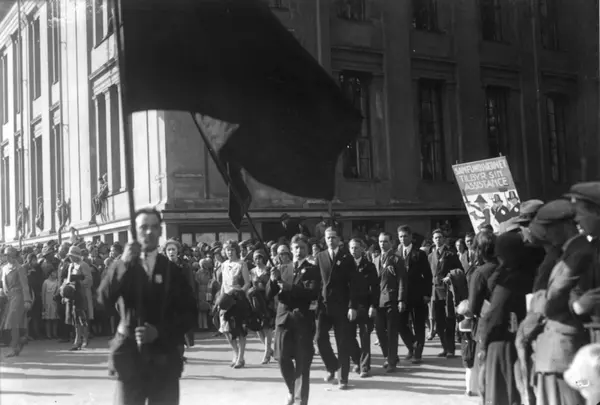 1. mai-tog, Karl Johans gate. 1930. Universitetet i bakgrunnen. Menn og kvinner. Faner. Tilskuere.