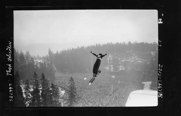 Skihopper i svevet ut over bakken, med antatt Nordmarka i bakgrunnen. Antakelig Holmenkollbakken eller Schrøderbakken. Fotografert før 1941 om riktig fotograf er oppgitt.