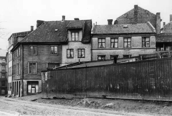 Hjørnet Vinkelgaten og Filosofgangen, Oslo. Gatebilde med gjerde og boliger.