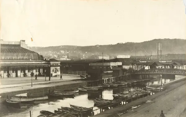 Akerselva i Oslo med Schweigaards bru. Kjøtthallen og trelastlager på motsatt side av elva.