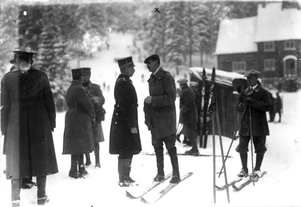 Kong Haakon VII på Holmenkollrenn. På ski. Publikum. Skiløpere. Skog.