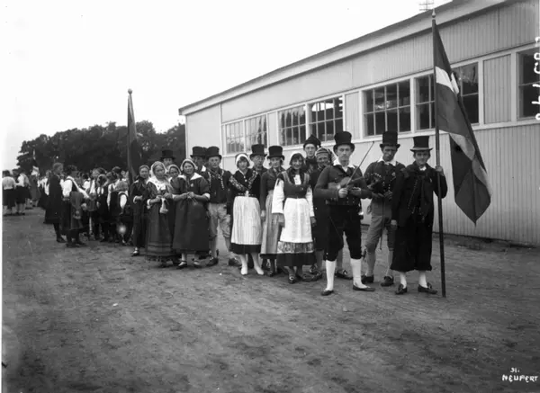 Nordisk Folkedansstevne ant Frogner stadion - Oslo. 1925. Opptog av ant. danske folkedansere foran Norges Varemesse. Flagg.