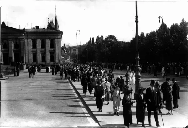 Karl Johans gate og Universitetet, Oslo 1925. Oversiktsbilde. Mennesker spaserer langs fortauene.