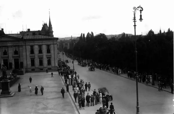 Karl Johans gate, Oslo. 1925. Oversiktsbilde. Universitetet til venstre. Studenterlunden til høyre. Stortinget i bakgrunnen. Spaserende. Biler.