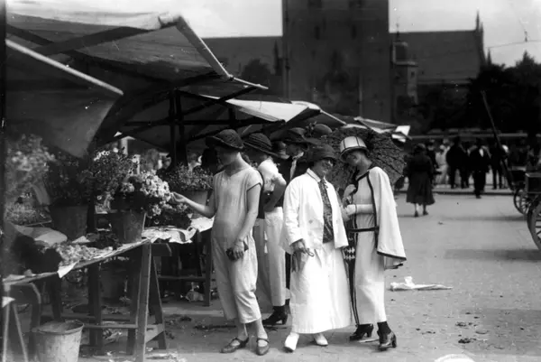 Sommerklær. Stortorvet, Oslo. 1924. Kvinner foran blomsterboder.