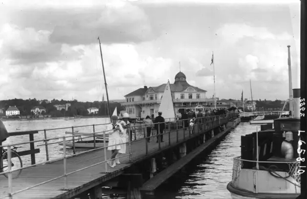 Oslo, Frognerkilen. Restaurant "Dronningen". Mennesker på gangbro og båter på vannet. Piker i matrosdrakt i forgrunnen.