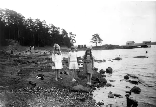 Barn i sommerkjoler i Paradisbukta på Bygdøy i Oslo i 1924. Barbeinte jenter i strandkanten. Badehusene bak tilhørte Villa Victoria