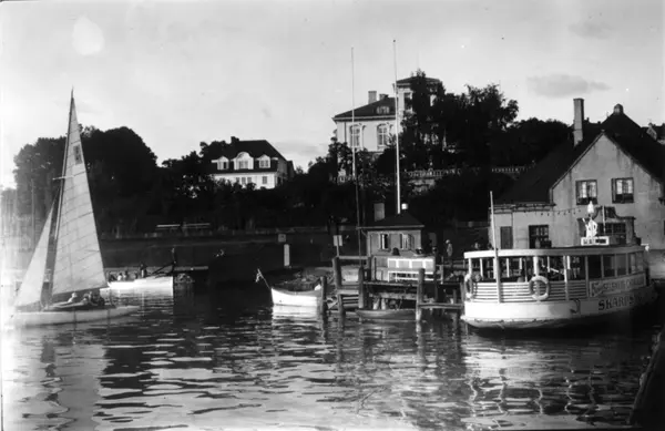 Oslo, Skarpsnofergen ved Skarpsno stasjon 1931. Menn og kvinner i båter. Trær. Boliger i bakgrunnen.