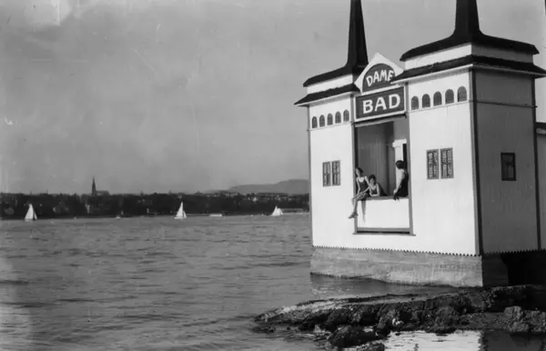Oslo, badehus på Bygdønes. 1927. Fra damebadet. Tre kvinner i badedrakt. Båter på Oslofjorden. Bebyggelse i bakgrunnen,