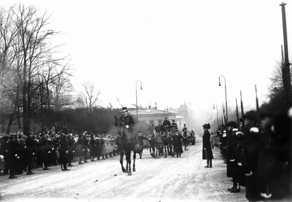 Håkon VII's 25. års jubileum. Parade på Karl Johansgate, Oslo. 1930. Oppstilte soldater og offiserer. Vogner trukket av hester.