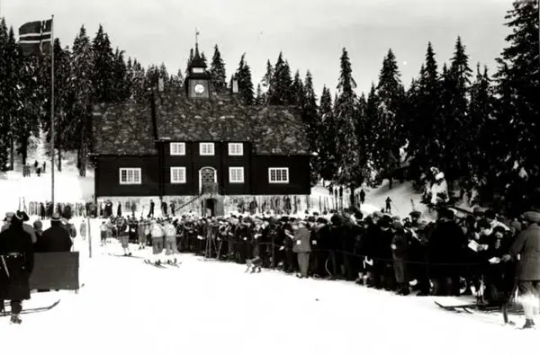 Frognerseteren, Nordmarka, Oslo. Vintermotiv. Skirenn. Publikum langs løypa. Hus og skog i bakgrunnen.