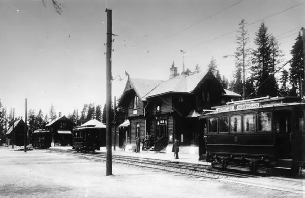 To trikker ved stasjonsbygning på holdeplass på Holmenkollbanen i Oslo. Bildet er tatt på daværende Holmenkollen stasjon rundt år 1900. Banen åpnet 1898. Stasjonsnavnet endret til Besserud da banen ble forlenget i 1917. Stasjonsbygningene på Holmenkollen (bildet) og Slemdal var begge bygget i 1898 og speilvendte av hverandre.
