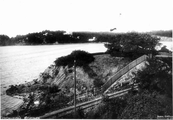 Oscarshall, Bygdøy, Oslo. Ved Frognerkilen, i forgrunnen jernbanespor.