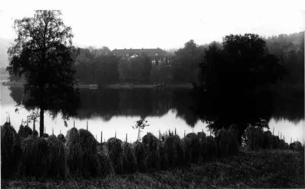 Bogstad gård og Bogstadvannet 1923. Kornstaur i forgrunnen. Hovedbygningen i bakgrunnen.