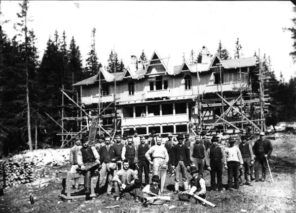 Holmenkollen, Oslo. Gruppeportrett av arbeidslag under byggingen av det første Holmenkollen turisthotell i 1889.