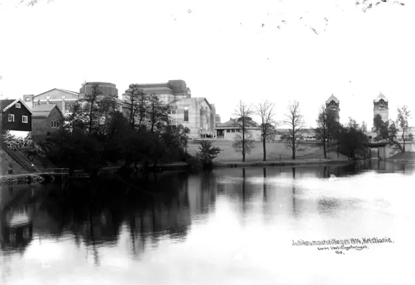 Jubileumsutstillingen på Frogner, Oslo, 1914. Industribygningen. Parkområde med paviljonger. Stor dam i forgrunnen.