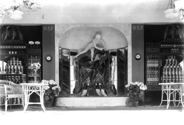 Jubileumsutstillingen på Frogner, Oslo, 1914. Interiør paviljong. Skulptur og reklame. Skulptur midt på bildet. På hver side av denne reklameprodukter.