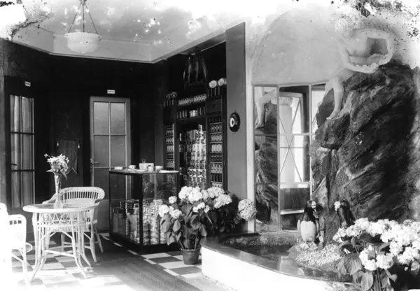 Jubileumsutstillingen på Frogner, Oslo, 1914. Interiør paviljonger. Skulptur til høyre i bildet. Blomster. Reklameprodukter i hyller i bakgrunnen.