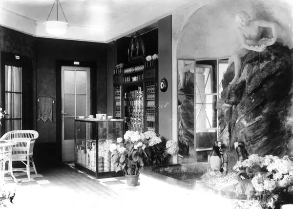 Jubileumsutstillingen på Frogner, Oslo, 1914. Interiør paviljong. Skulptur av kvinne. To lundefugler foran denne. Blomster på hver side av skulpturen. Reklameprodukter
