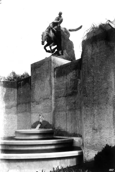 Jubileumsutstillingen på Frogner, Oslo, 1914. Skulpturen Helhesten av Gunnar Utsond. Springvann i forgrunnen.