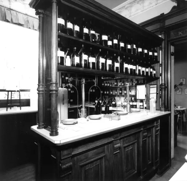 St. Hanshaugens apotek i Collettsgt. 33, Oslo. Fotografert november 1972. Apoteket ble opprettet i 1899 og åpnet 19. august 1900. De holdt til i de samme lokalene til apoteket ble lagt ned i 1973.