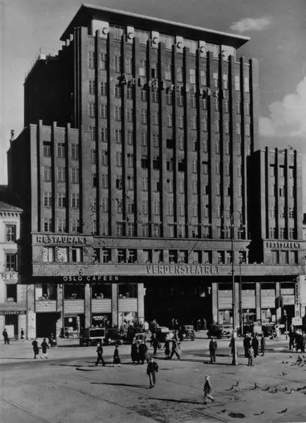 Folketeaterbygningen på Youngstorget i Oslo sett fra torget, med mennesker og biler foran. Her hadde bl.a. Arbeiderbladet sine lokaler frem til 2. verdenskrig. Under krigen tok Quisling-avisen "Fritt Folk" over lokalene.