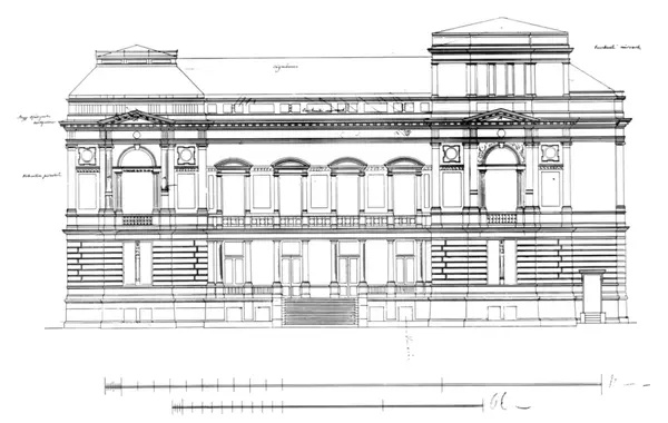 Videnskapsakademiet. Drammensveien 78, Oslo. Foto av tegning av fasaden mot Frognerkilen. 1885. Arkitekt Herman Major Backer.
