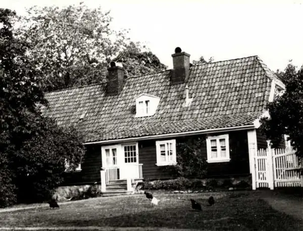 Maristuen, Langviksveien 17, Bygdøy, Oslo. Lavt trehus i hage, høns foran huset.