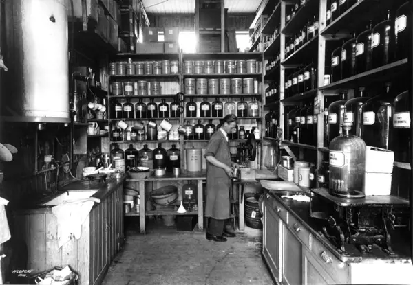 Rådhusapoteket, Oslo. 1935-1937. Provisorisk brakke. Laboratoriet. En mann i arbeid. Hyller med flasker og krukker med ingredienser.