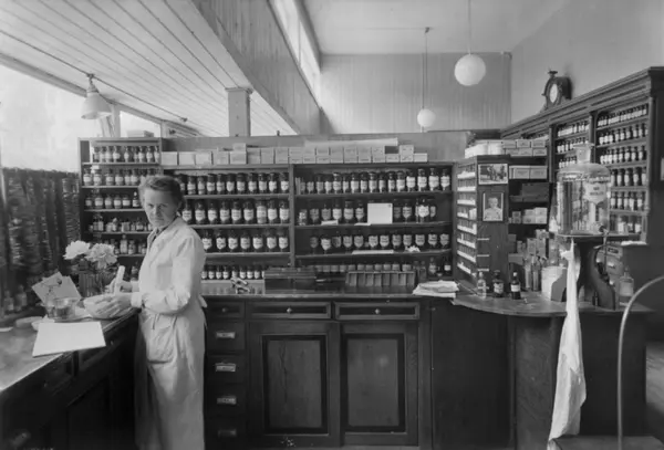 Rådhusapoteket, Oslo. 1935-1937. Interiør. Disk med skuffer. Kvinne ved disken. Hyller med aptokekervarer i flasker