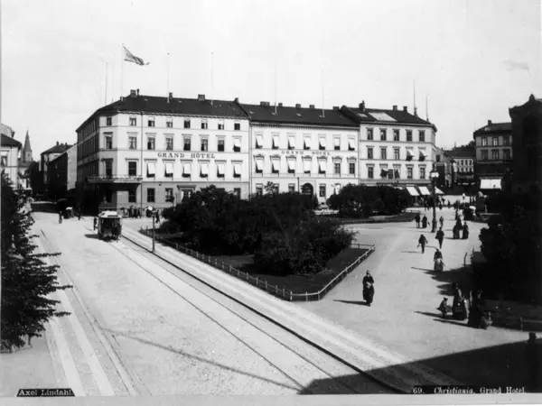 Grand Hotel, Karl Johans gate, Oslo 1885-90. Gatebilde med hotellet, Eidsvoll plass, mennesker og hestetrikk. Sett fra Rosenkrantz' gate.