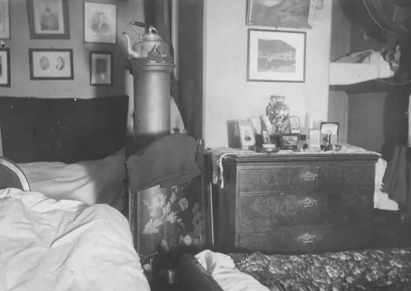 Interiør, stue, ant. Oslo. Senger oppredd for natten mellom tett møblering ellers (se "Andre opplysninger"). Fra boliginspektør Nanna Brochs boligundersøkelser i Oslo 1920-årene.
