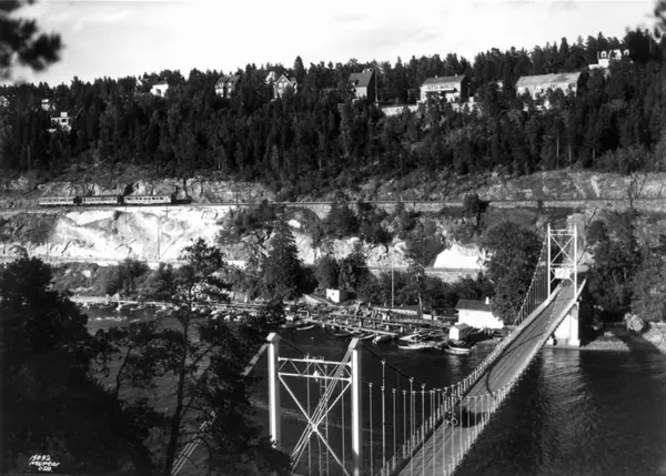 Bekkelaget, Oslo 1937. Brua over til Ulvøya. Bil på brua. Brygger med fortøyde båter ved fjorden nedenfor. Vei og jernbanespor i bakgrunnen opp mot bebyggelse og skog. Tog.