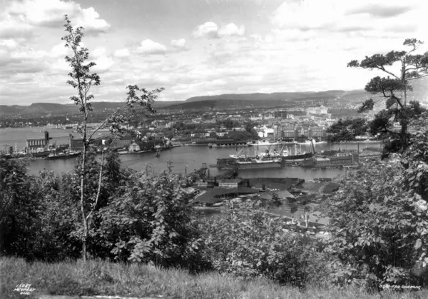 Oslo havn 1936. Utsikt over byen og havna fra Ekeberg. Skip ved kai. Seilbåter på fjorden. Havnelageret ses midt i bildet. Skog og åser i bakgrunnen.