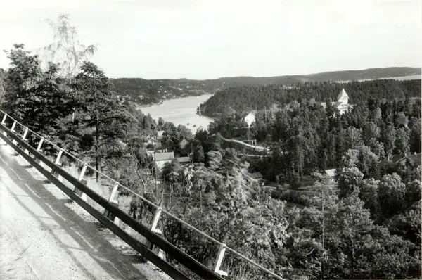 Nedre Bekkelaget, med Ulvøya i bakgrunnen. Bildet er sannsynligvis tatt fra Bekkelagsveien. Dette er tatt før raset på Nedre Bekkelaget da både veien og togtrasseen var annerledes enn i dag.